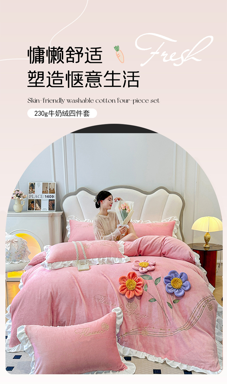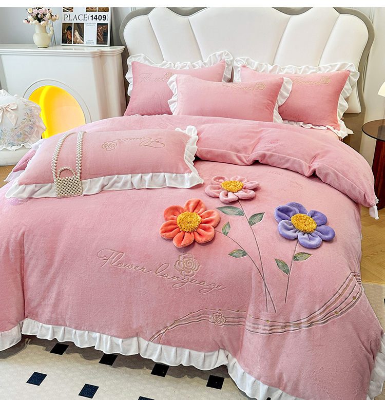 9斤高端韩版少女心法式公主风贴布绣花牛奶绒四件套小清新绒兔毛绒法莱绒床盖被套丝绒兔毛绒法莱绒床盖被套 锦上添花-奶油粉