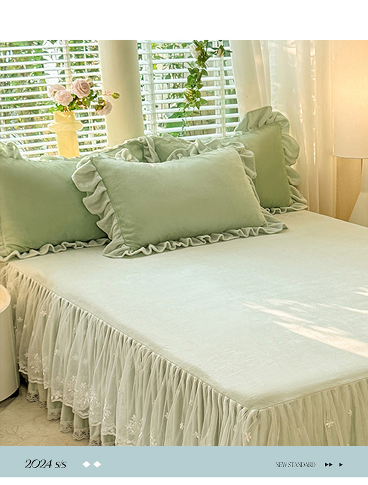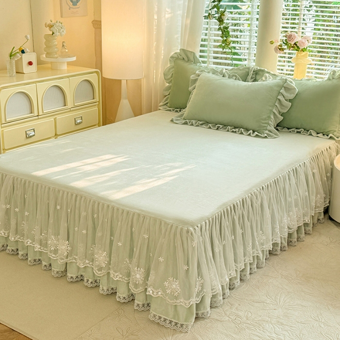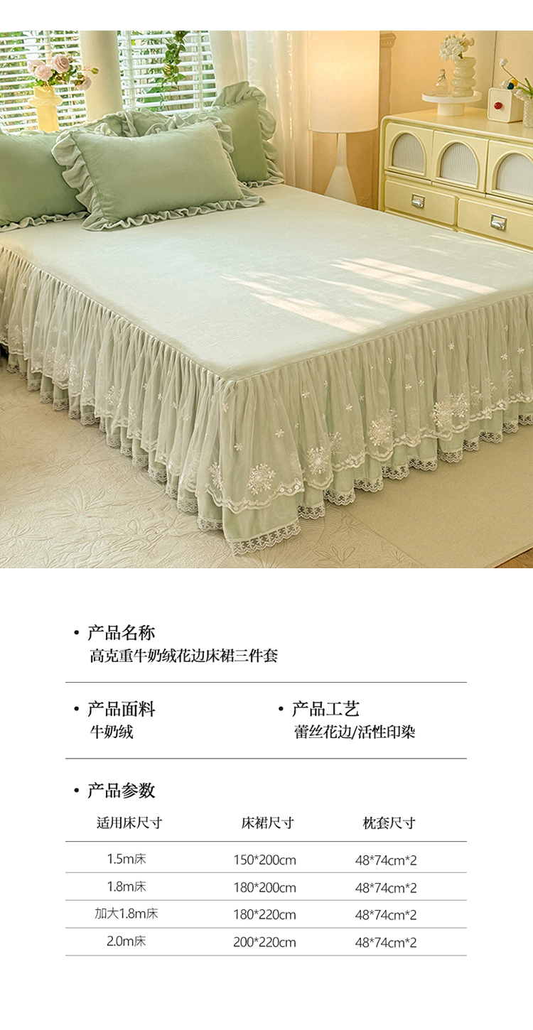 苏米娜2024秋冬新款230g全消光牛奶绒床裙款三件套纯色蕾丝花边刺绣床裙款床盖款法莱绒婴儿绒金貂绒三件套 甜心—新芽绿