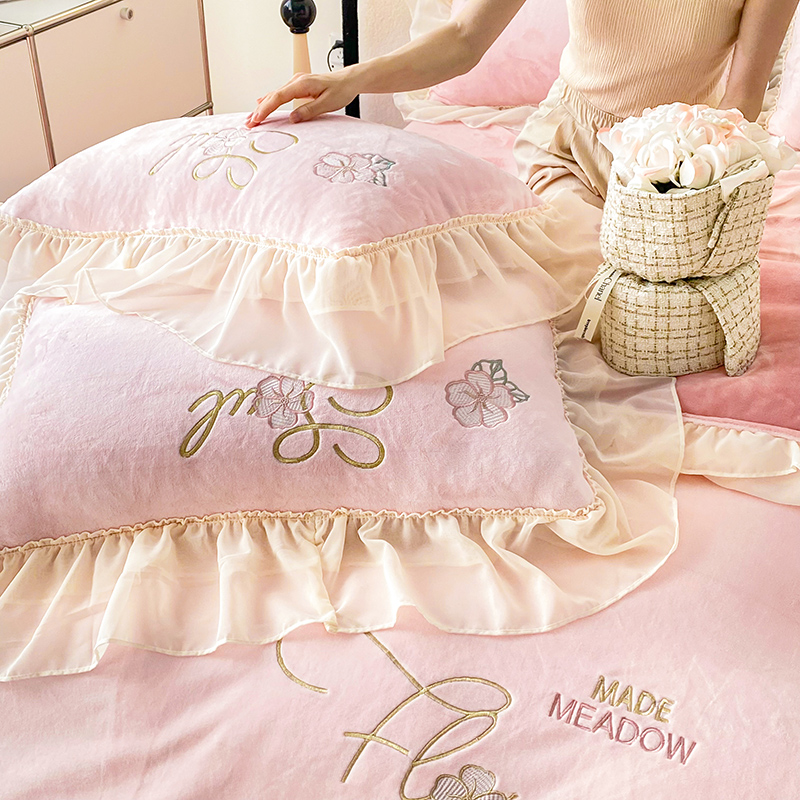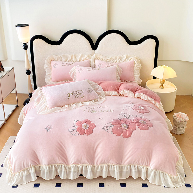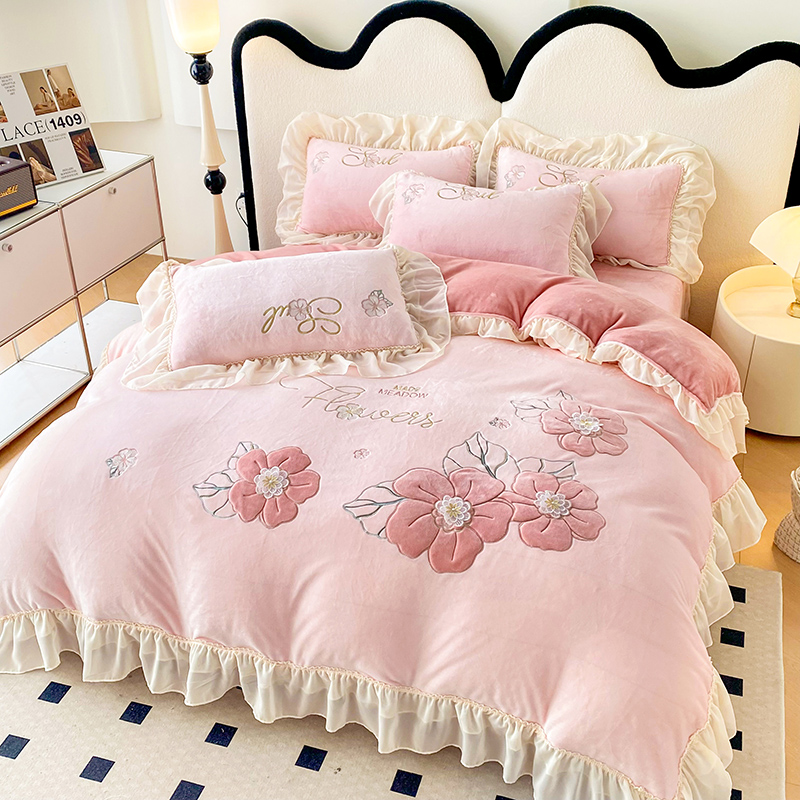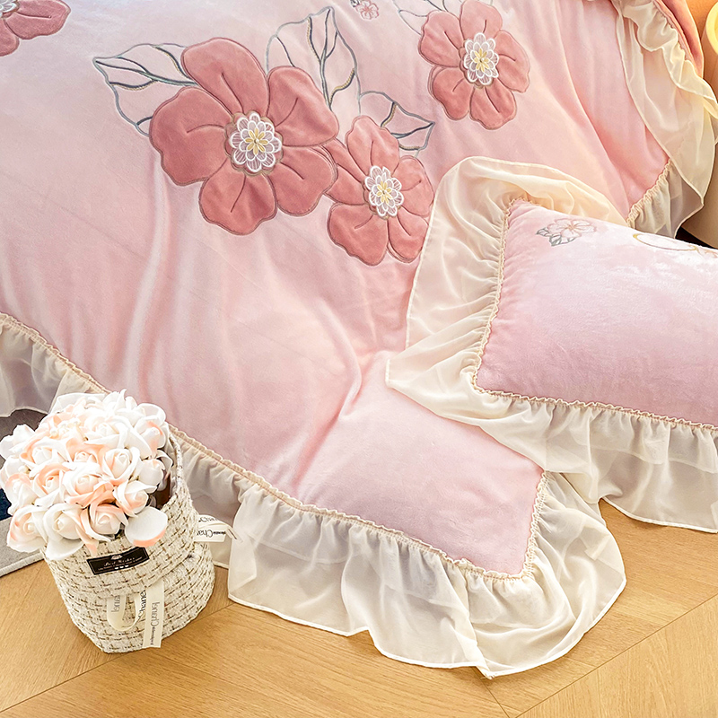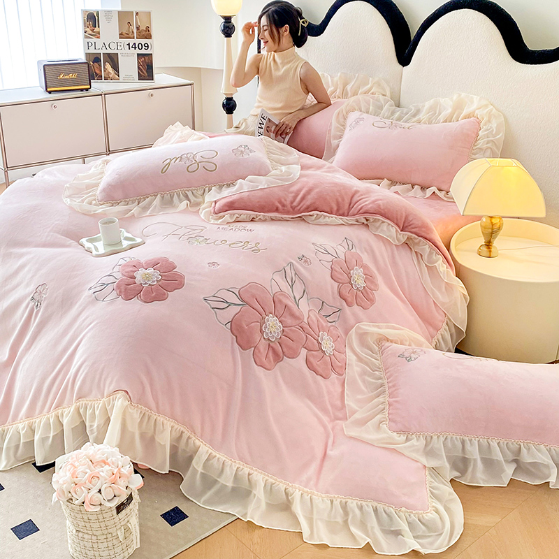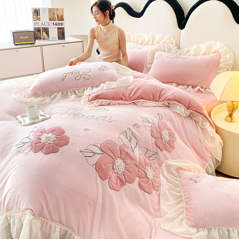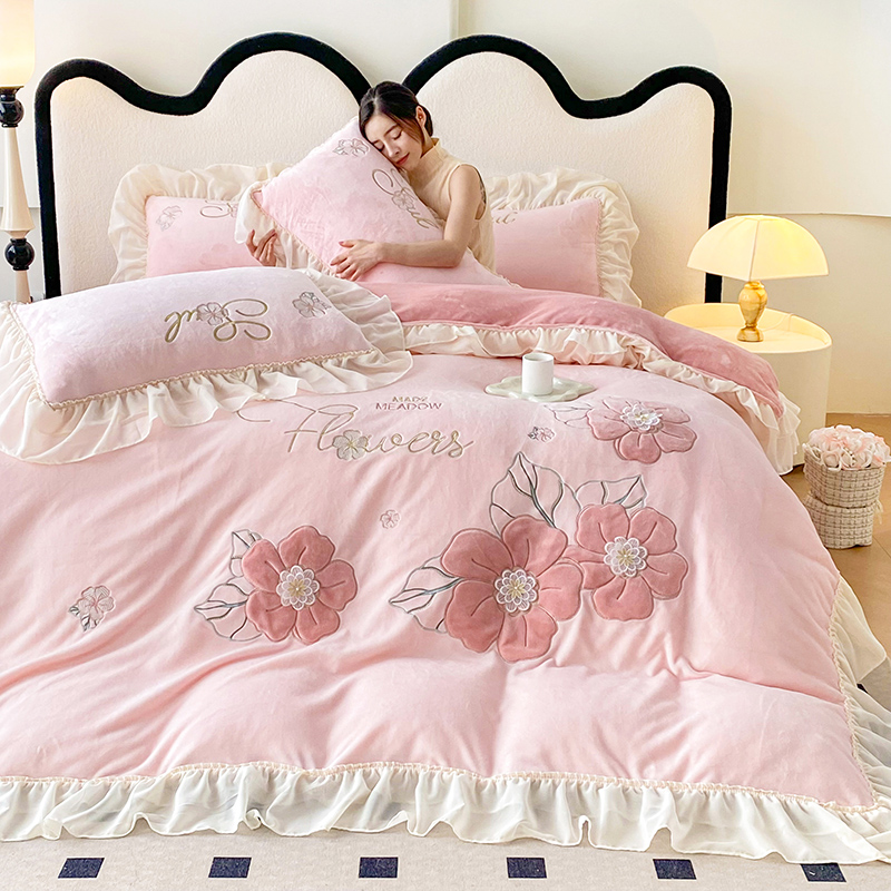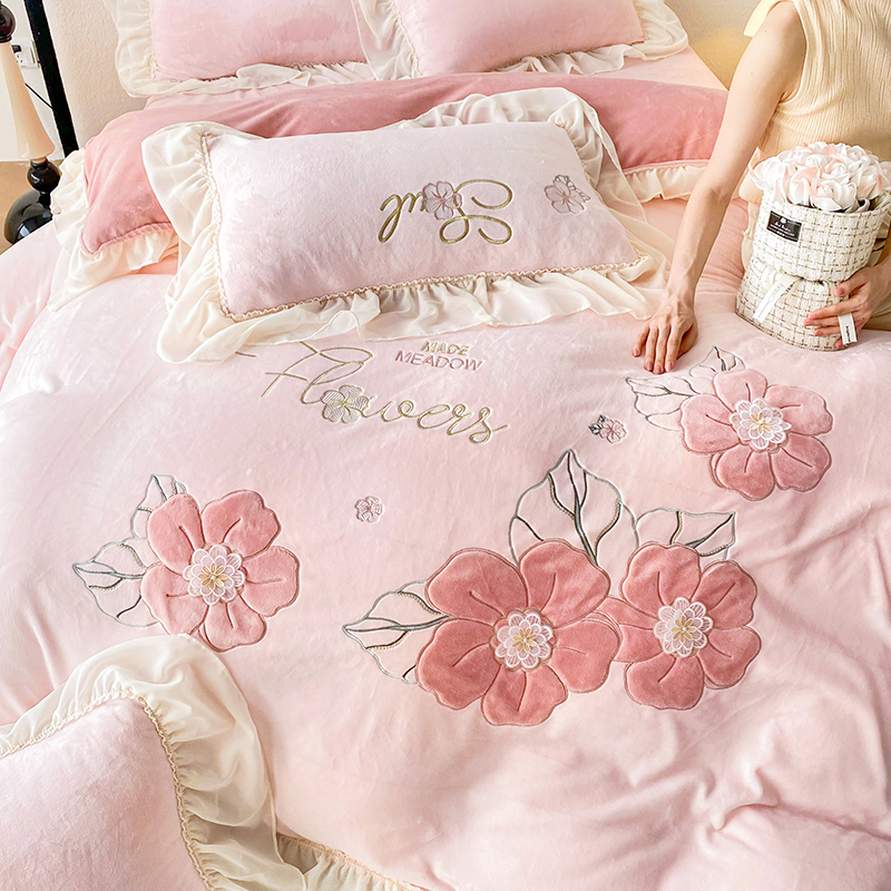2024加厚大版花卉牛奶绒刺绣花四件套小清新公主风韩版婴儿绒宝宝绒兔绒法莱绒金貂绒四件套床单床盖款单被套 安琪儿—樱花粉
