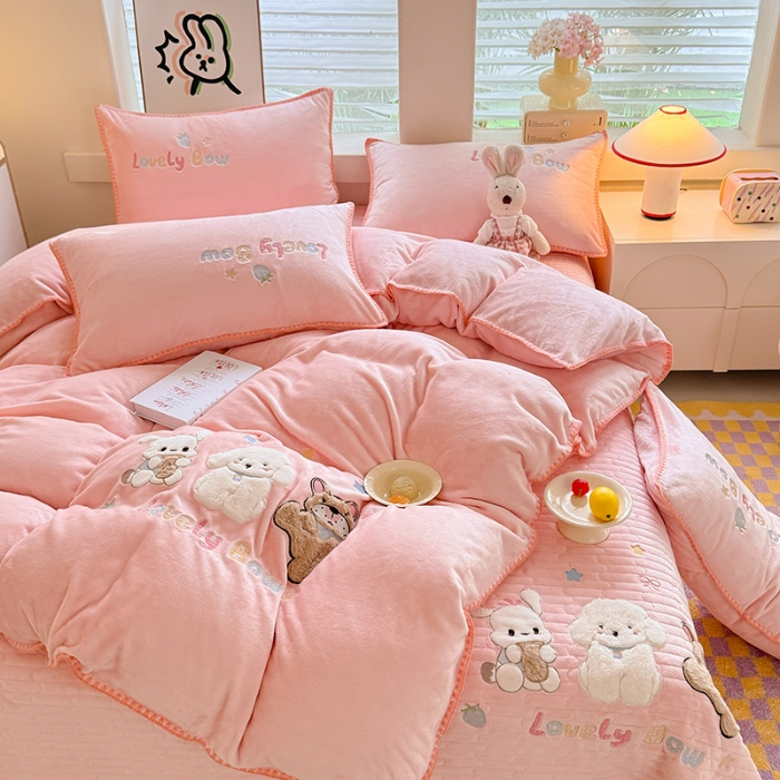 苏米娜家纺2025新款230g全消光大版卡通牛奶绒兔毛贴布绣花四件套可爱卡通男孩女孩法莱绒被套三件套 欢乐兔