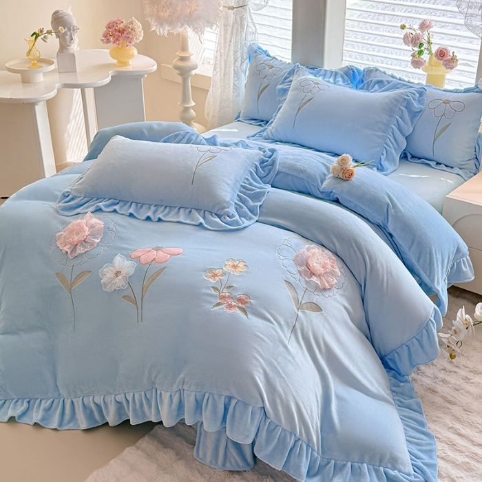 当前位置:苏米娜家纺SUMINA > 苏米娜家纺SUMINA 2025新款230g高克重韩版立体盘花牛奶蚕丝绒绣花四件套床裙款被套-洛丽塔系列 洛丽塔-婴儿蓝