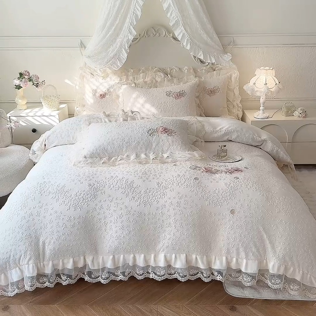 当前位置:苏米娜家纺SUMINA > 2025苏米娜360g全消光牛奶绒工艺款蕾丝盘花立体雕花绒牛奶绒四件套刺绣绣花套件 温婉-奶油白