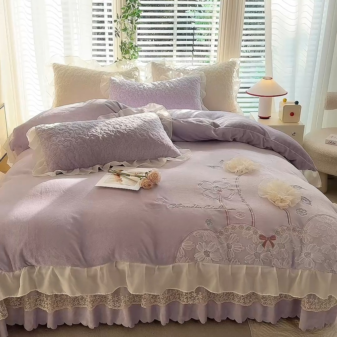 苏米娜2025秋冬新款230g11斤重立体花朵全消光牛奶绒床盖四件套加厚婴儿绒法莱绒床裙款床盖款四件套 梦幻花园--梦幻紫