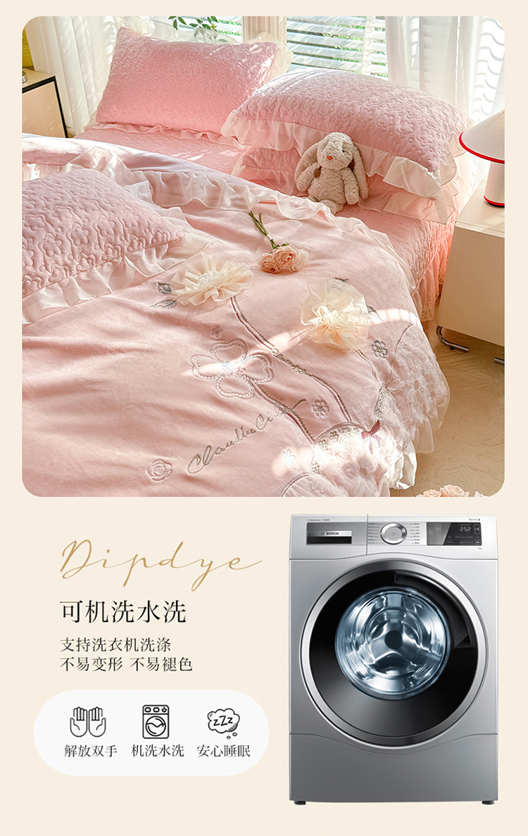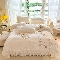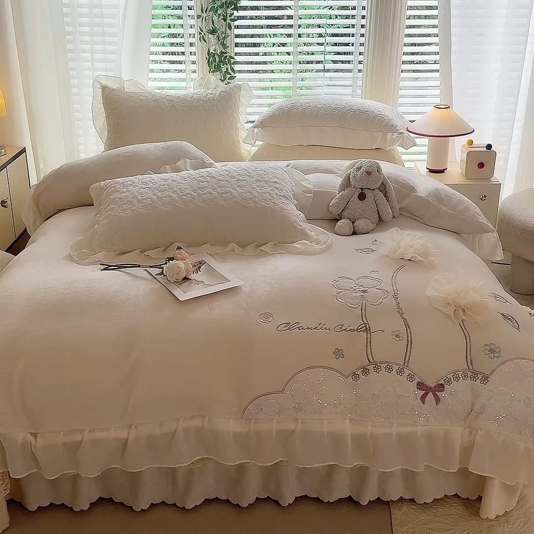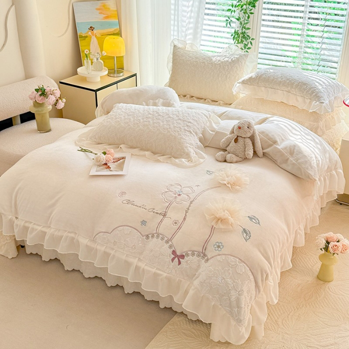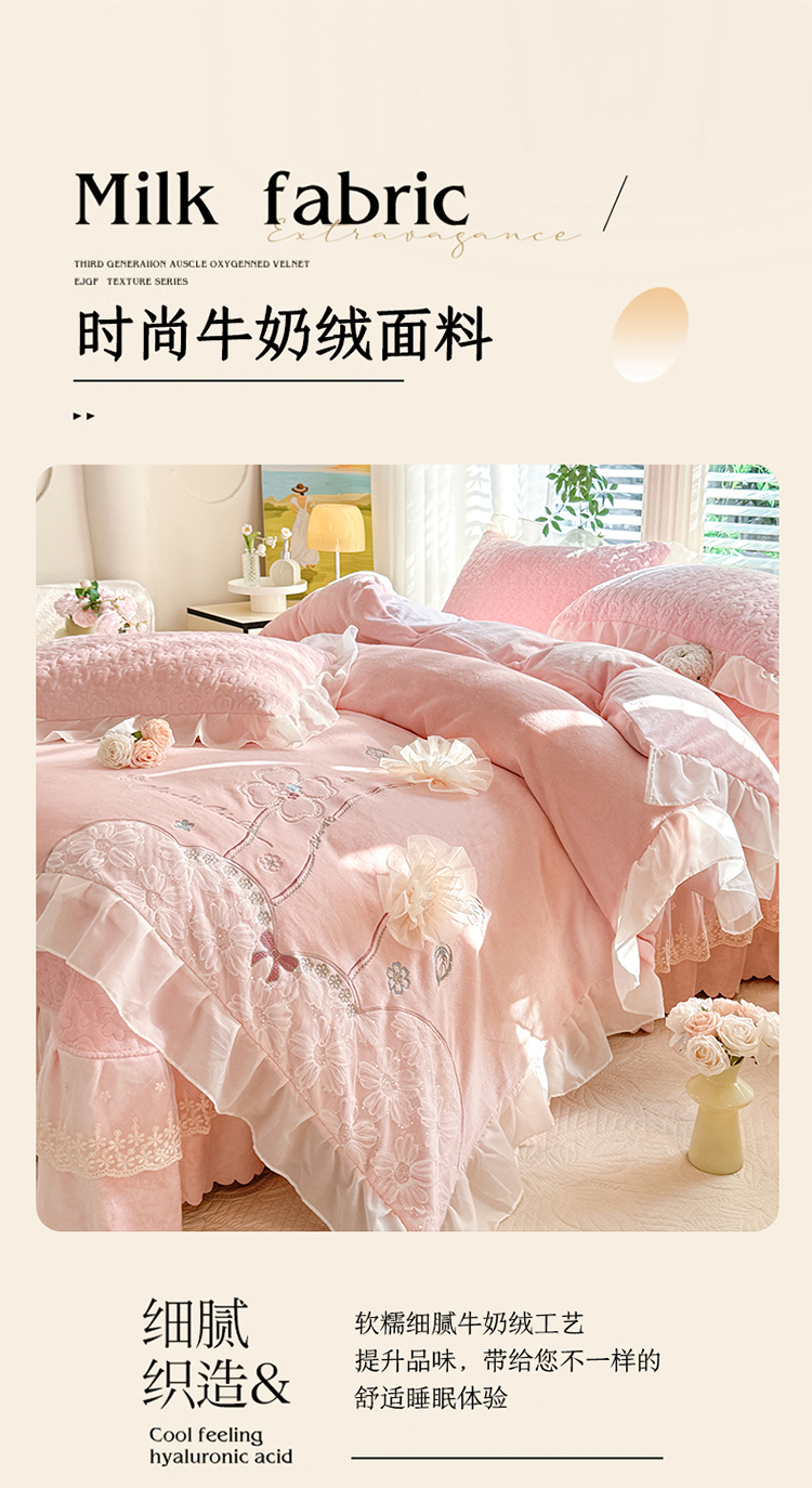 苏米娜2025秋冬新款230g11斤重立体花朵全消光牛奶绒床盖四件套加厚婴儿绒法莱绒床裙款床盖款四件套 梦幻花园—奶昔白