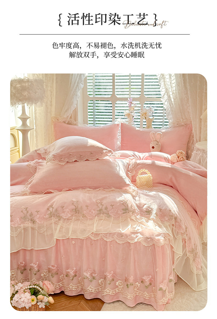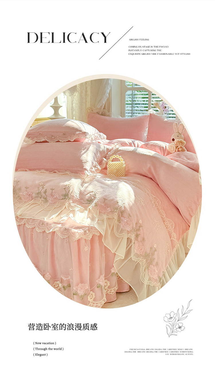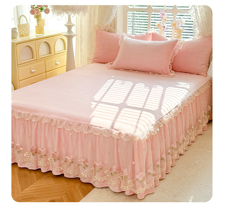 苏米娜2025秋冬新款230g双层绣花花边全消光牛奶绒床裙款四件套纯色蕾丝花边刺绣床裙款三件套 依恋-香芋紫
