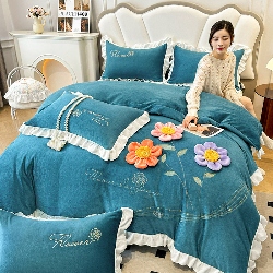 9斤高端韩版少女心法式公主风贴布绣花牛奶绒四件套小清新绒兔毛绒法莱绒床盖被套丝绒兔毛绒法莱绒床盖被套 锦上添花-宾利蓝