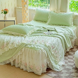苏米娜2025甄选A类凉豆豆纯色系蕾丝花边床裙款床单款床盖床单凉席三件套蕾丝床盖款凉席三件套 唯爱-新芽绿