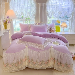 苏米娜2025秋冬新款230g双层绣花花边全消光牛奶绒床裙款四件套纯色蕾丝花边刺绣床裙款三件套 依恋-香芋紫