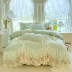 少女心法式公主风水洗棉蕾丝花边绣花夏被床盖款四件套