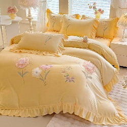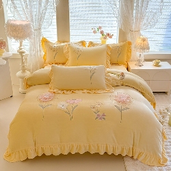 苏米娜家纺SUMINA 2025新款230g高克重韩版立体盘花牛奶蚕丝绒绣花四件套床裙款被套-洛丽塔系列 洛丽塔-嫩黄