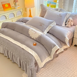 苏米娜2025秋冬简约轻奢款230g全消光牛奶绒兔毛绒贴布绣夹棉床盖款四件套纯色蕾丝花边刺绣床裙款床盖--心愿系列 心愿-高级灰