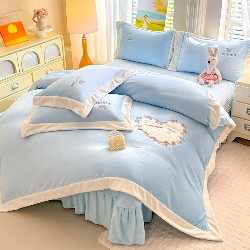 苏米娜2025秋冬简约轻奢款230g全消光牛奶绒兔毛绒贴布绣夹棉床盖款四件套纯色蕾丝花边刺绣床裙款床盖--心愿系列 心愿—婴儿蓝